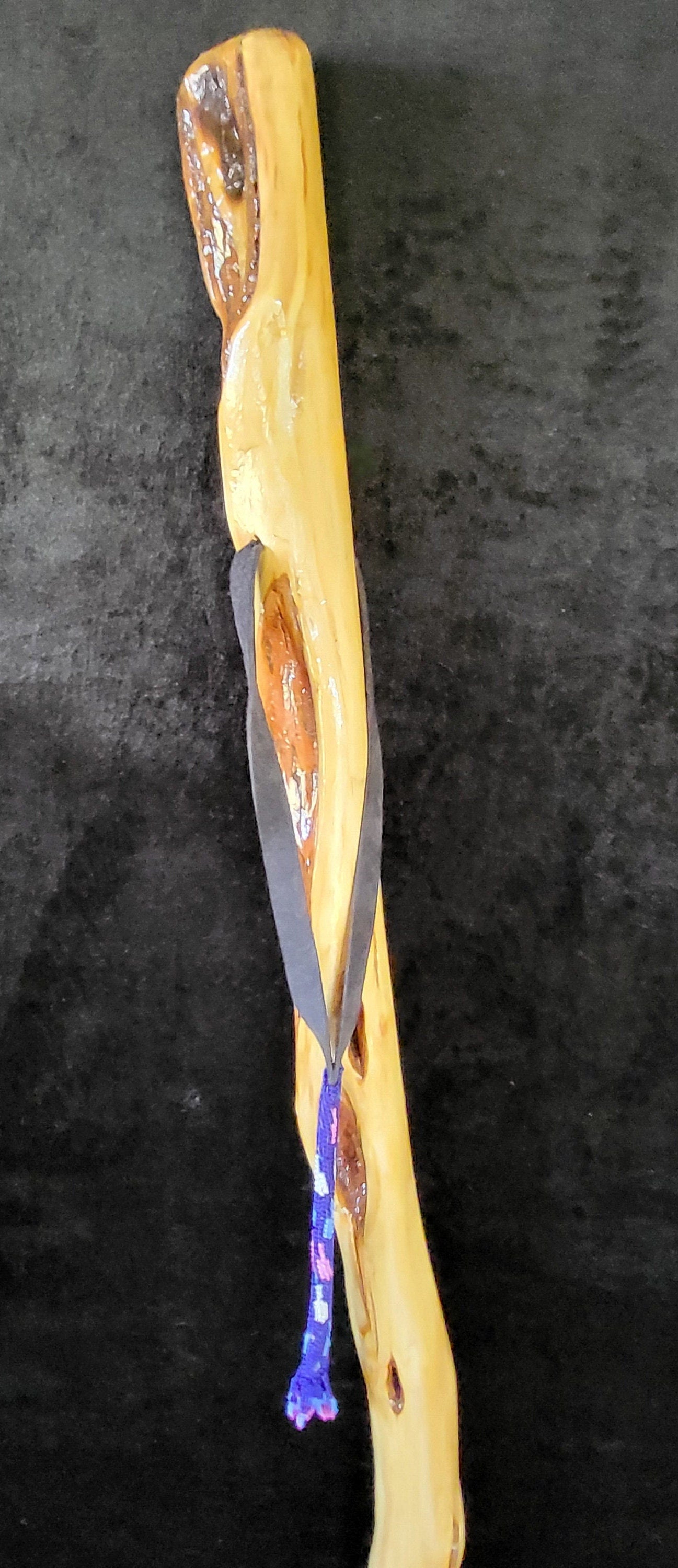 Beautiful 60 inch Diamond Willow staff. Beautifully carved 1 1/4 inch diameter staff. Smooth gloss finish and has a black leather strap and a 6 inch hand beaded blue tassel that has a design of colored feathers. The staff was carved by Tami Rock and the tassel was beaded by Sandy Basswood. Both Tami and Sandy are tribal artisans from Pine Point Village which is a part of the White Earth Nation Tribe of the Ojibwe in Northern Minnesota. Certificate of Authenticity Included.