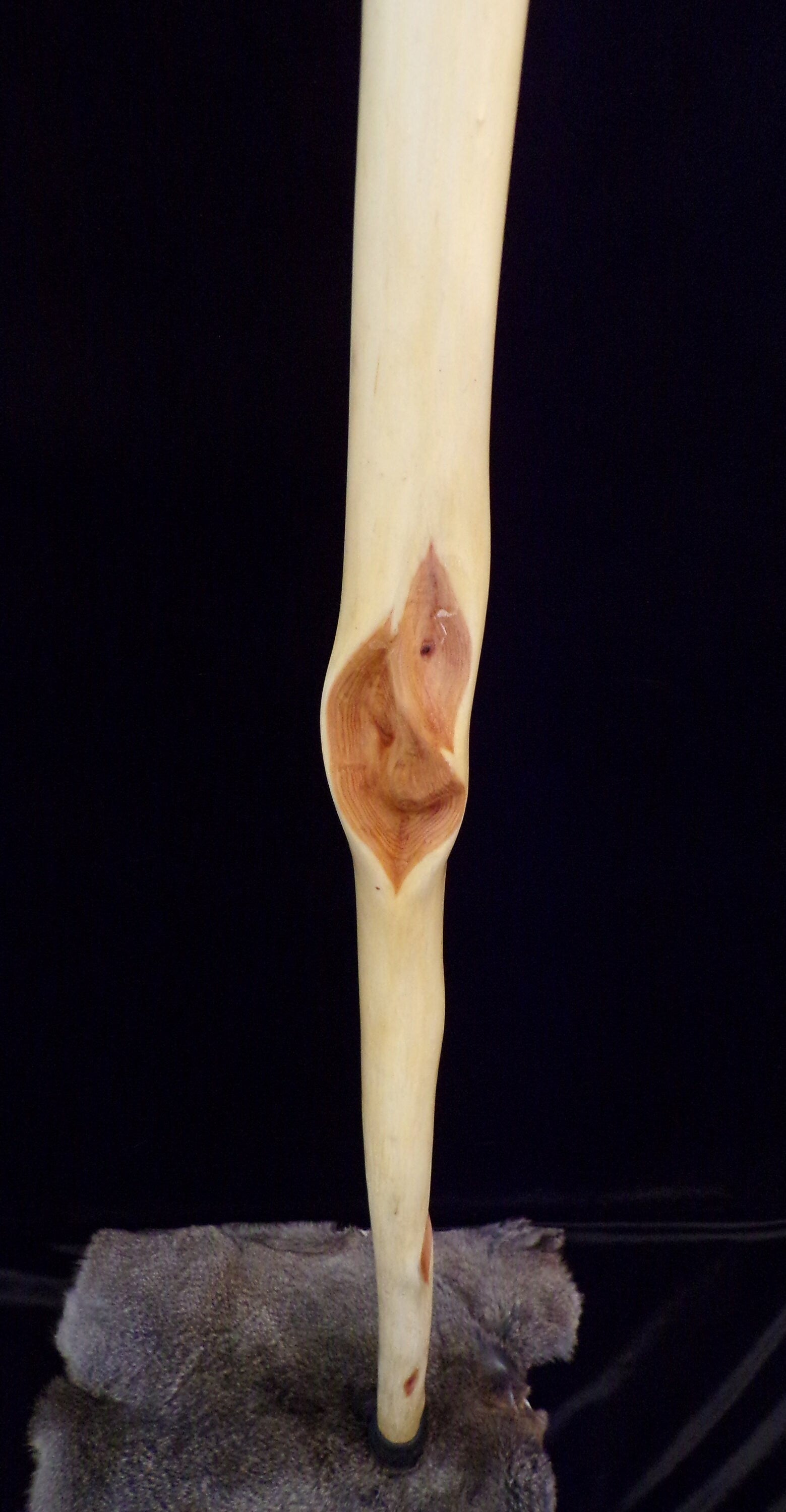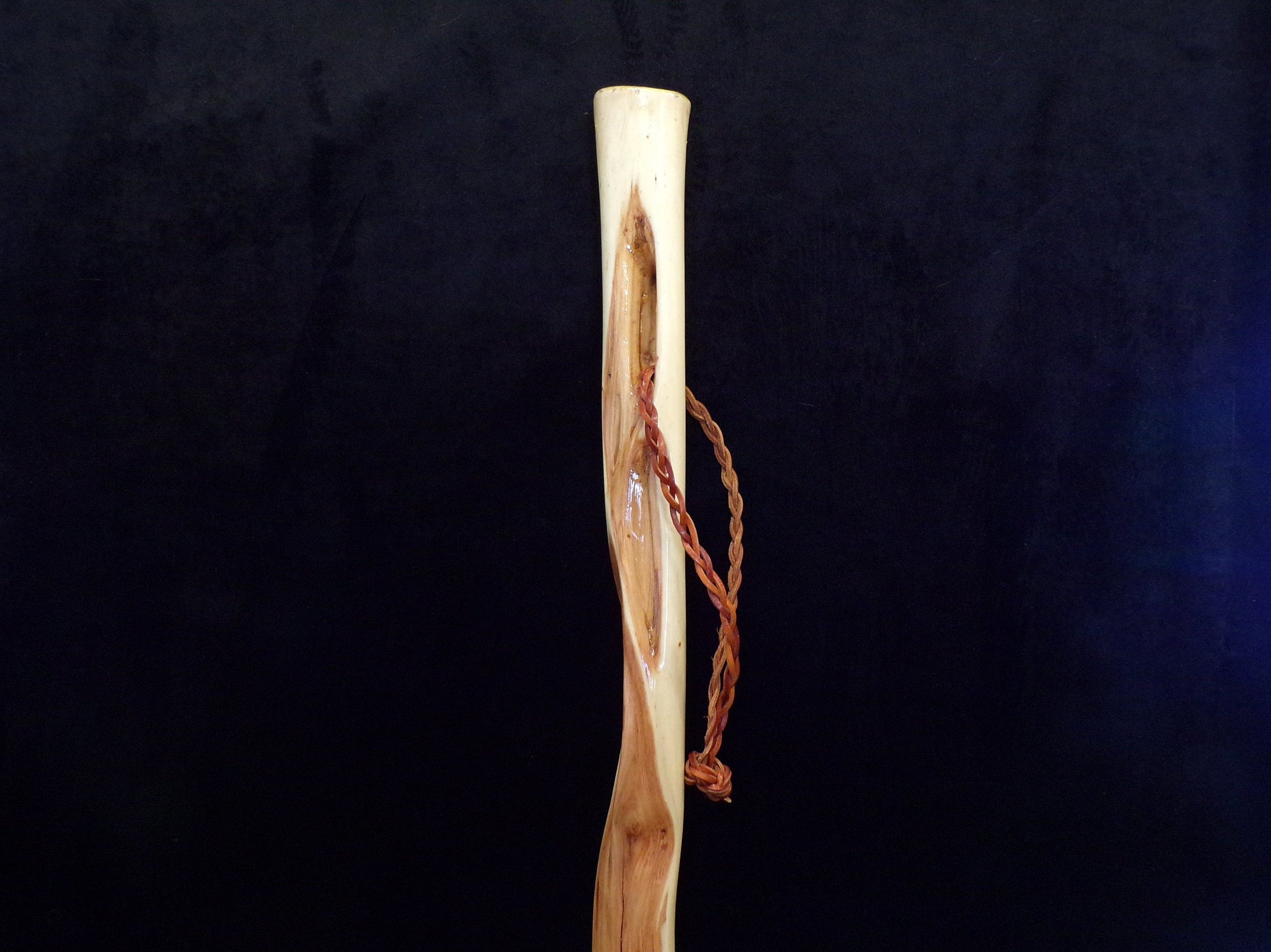 This 64 inch blond Diamond Willow staff is elegantly carved and beautifully finished. The braided leather strap goes through a natural open slot toward the top of the staff. About 1 1/2 inch diameter. Very strong but being Willow, weighs only 36 ounces.