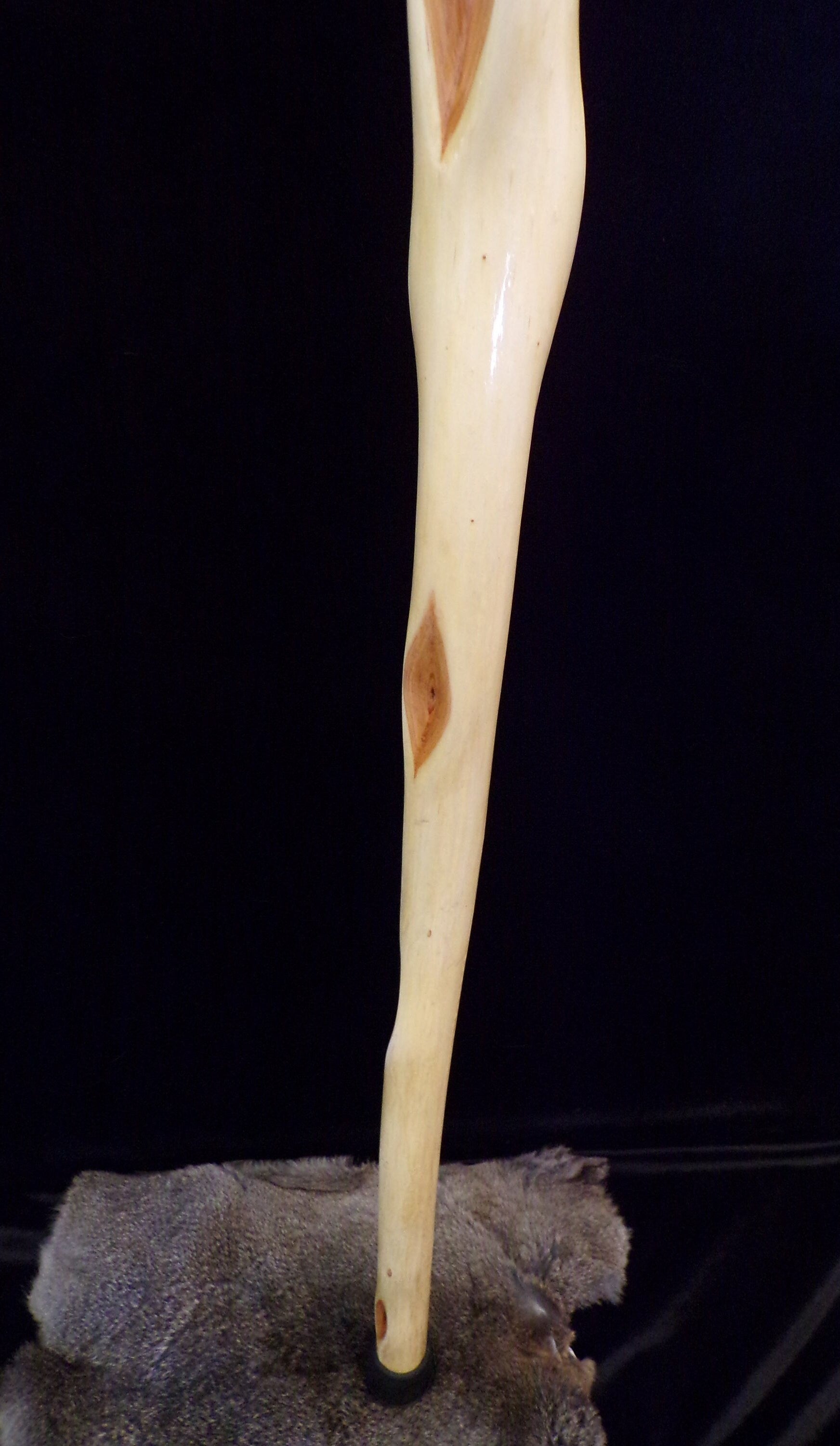 This staff was made by John Butcher. John is a Pine Point tribal artisan who lives of the White Earth Nation Reservation in Northern Minnesota.