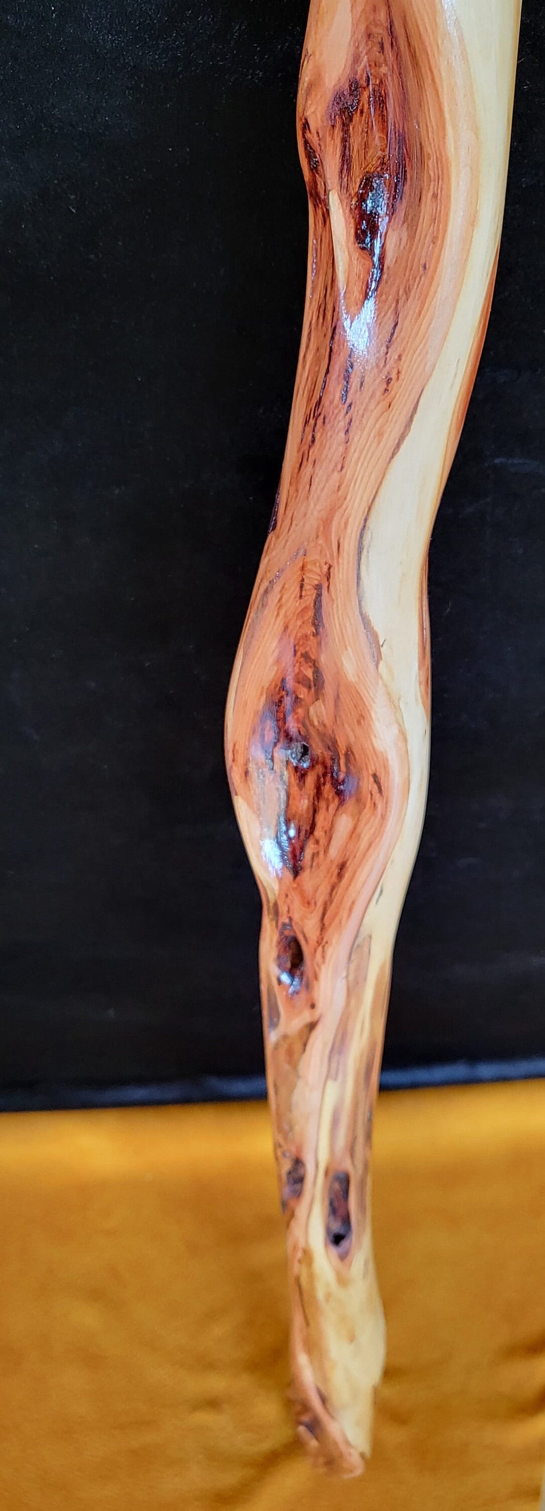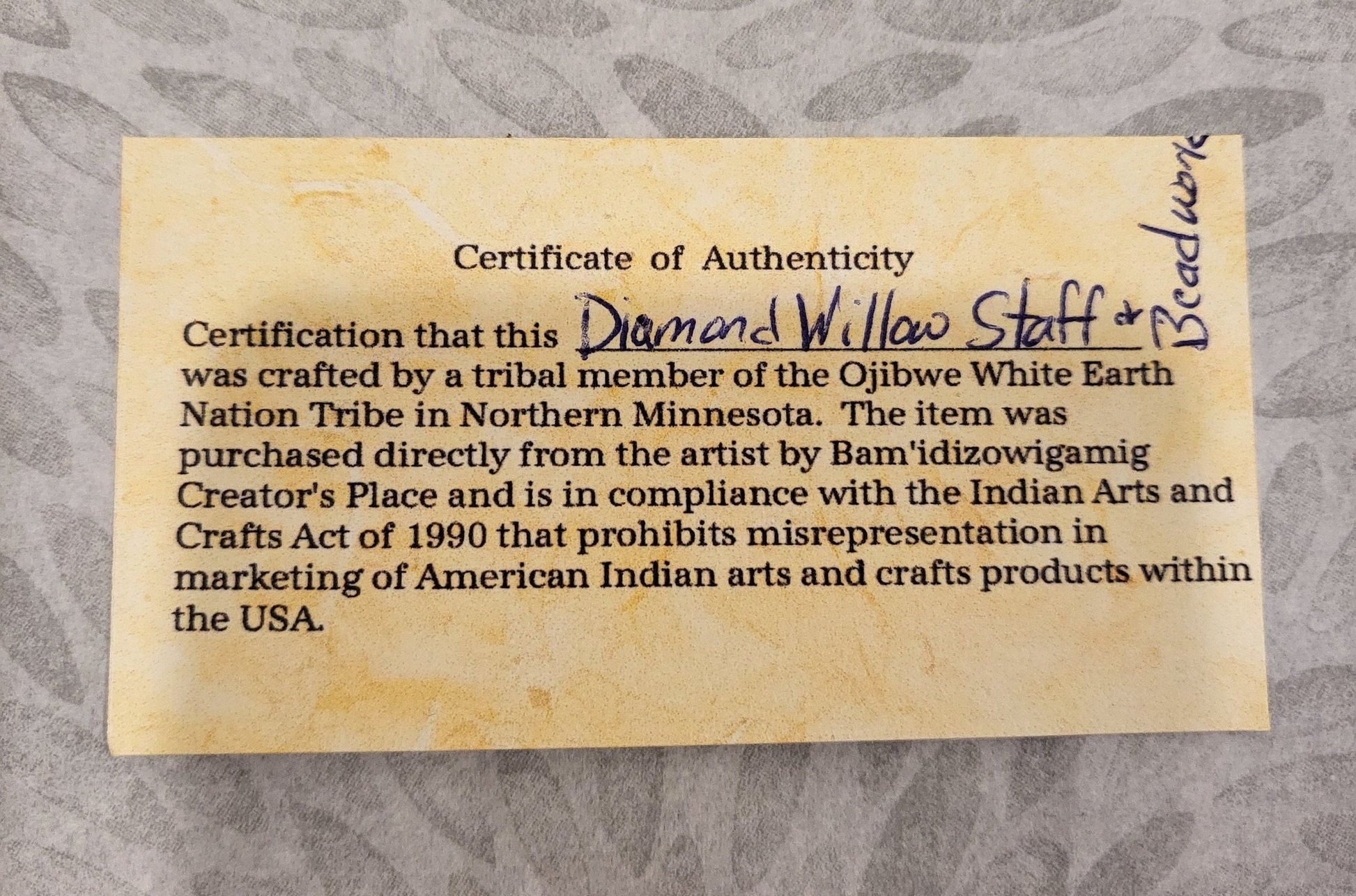 Gorgeous 63 inch Diamond Willow staff. Beautifully carved 1 1/2 inch diameter staff. Smooth gloss finish and has a black leather strap and a 6 inch hand beaded yellow tassel that has a design of colored feathers. The staff was carved by Terry Bloom and the tassel was beaded by Sandy Basswood. Both Terry and Sandy are tribal artisans from Pine Point Village which is a part of the White Earth Nation Tribe of the Ojibwe in Northern Minnesota. Certificate of Authenticity Included.