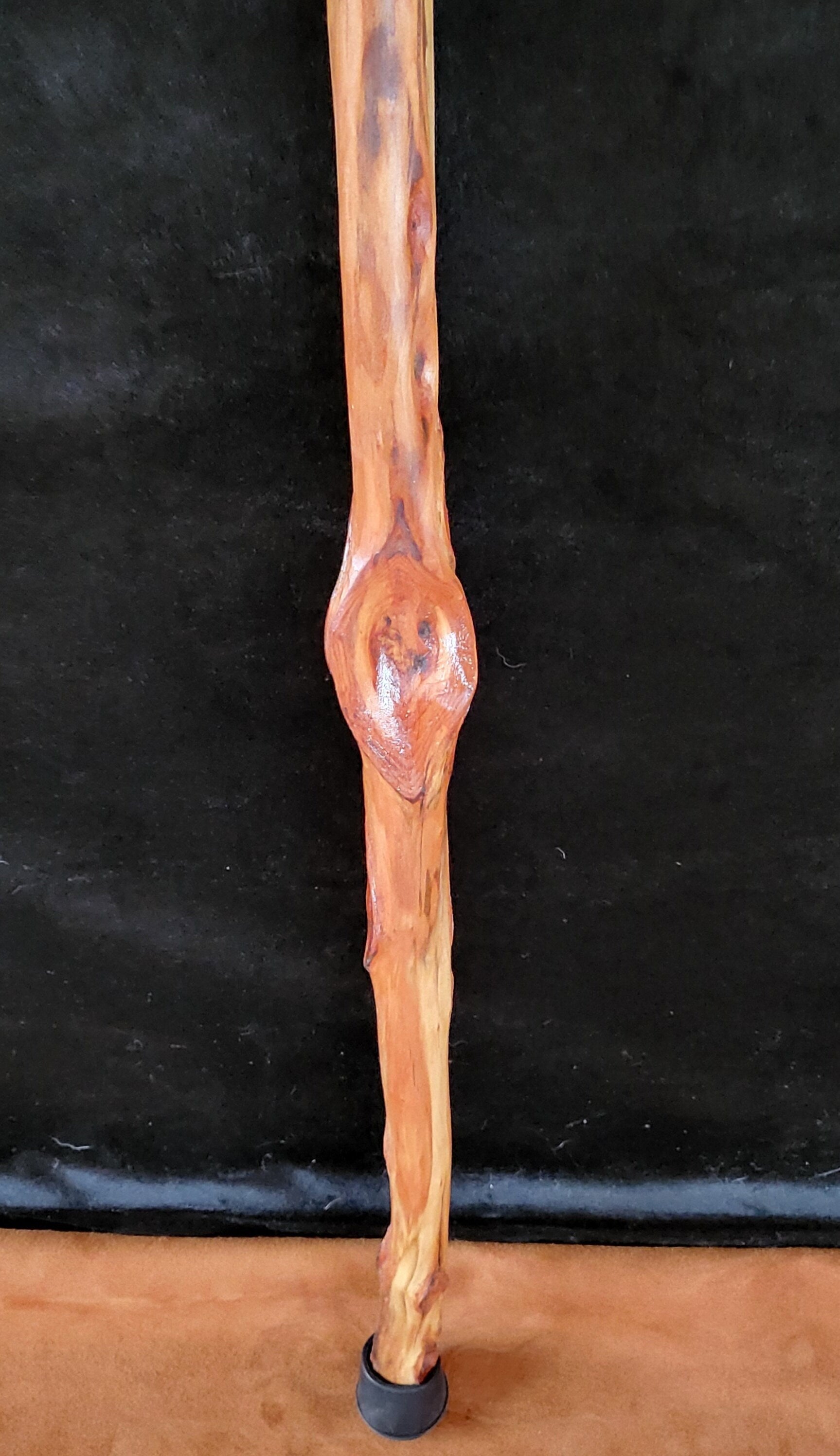 53 inch beautifully hand carved Diamond Willow hiking staff. This stick has both regular and reverse carved diamonds and only weighs 19 ounces. About 1 inch diameter top to bottom. Hand Braided leather cord passes through a natural pass-through diamond at the top. Tribal elder and artisan Bill Libby respectfully harvested this stick, carved away the thick bark and excess wood in the diamonds, sanded it, stained it and finished it with satin polyurethane.
