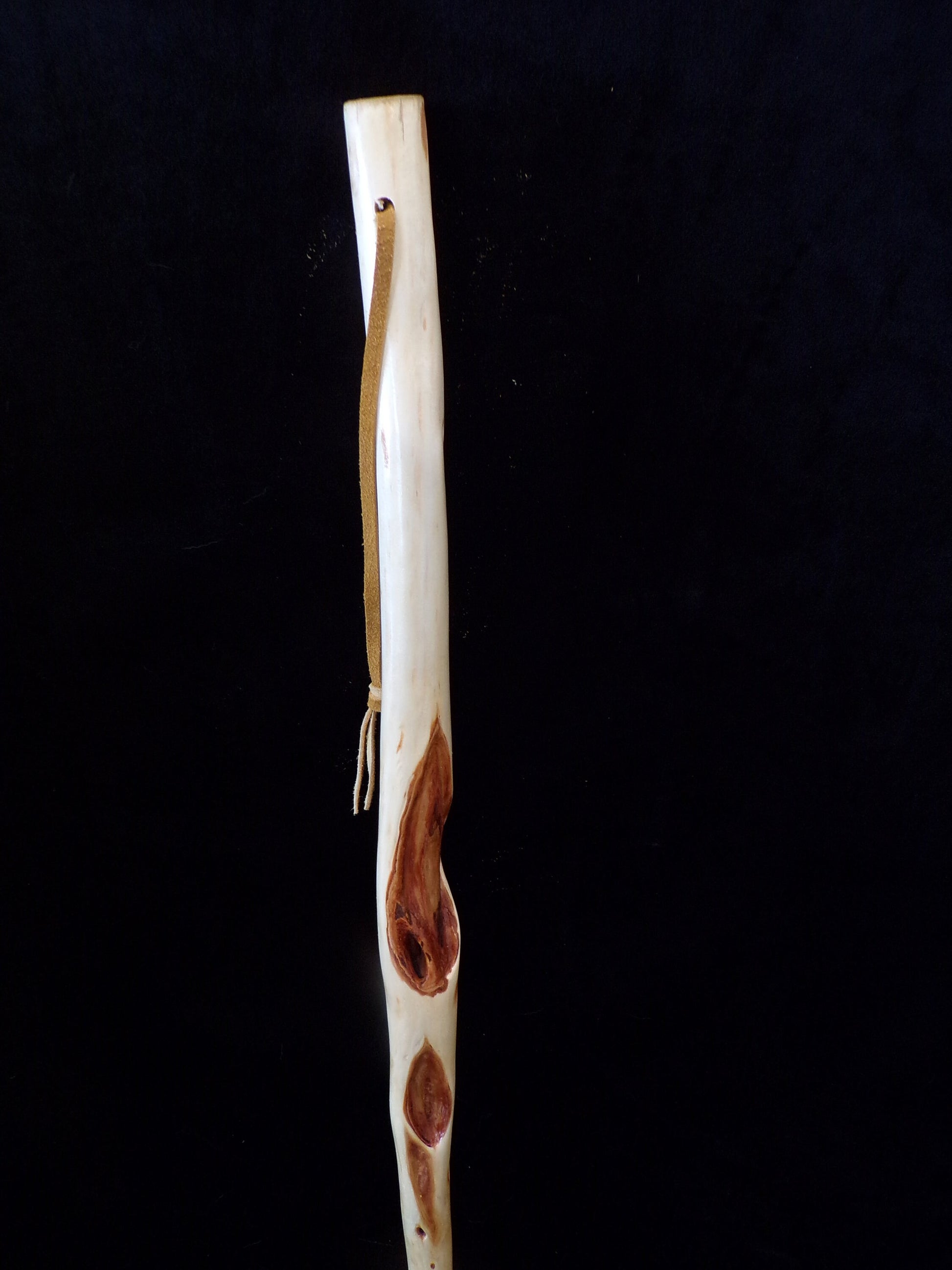 This 49 inch, strong but lightweight Diamond Willow walking stick is beautifully carved and finished. A pleasure to touch and weighing it at just 12 oz. it will be a pleasure to take on hikes. Polyurethane protective finish.