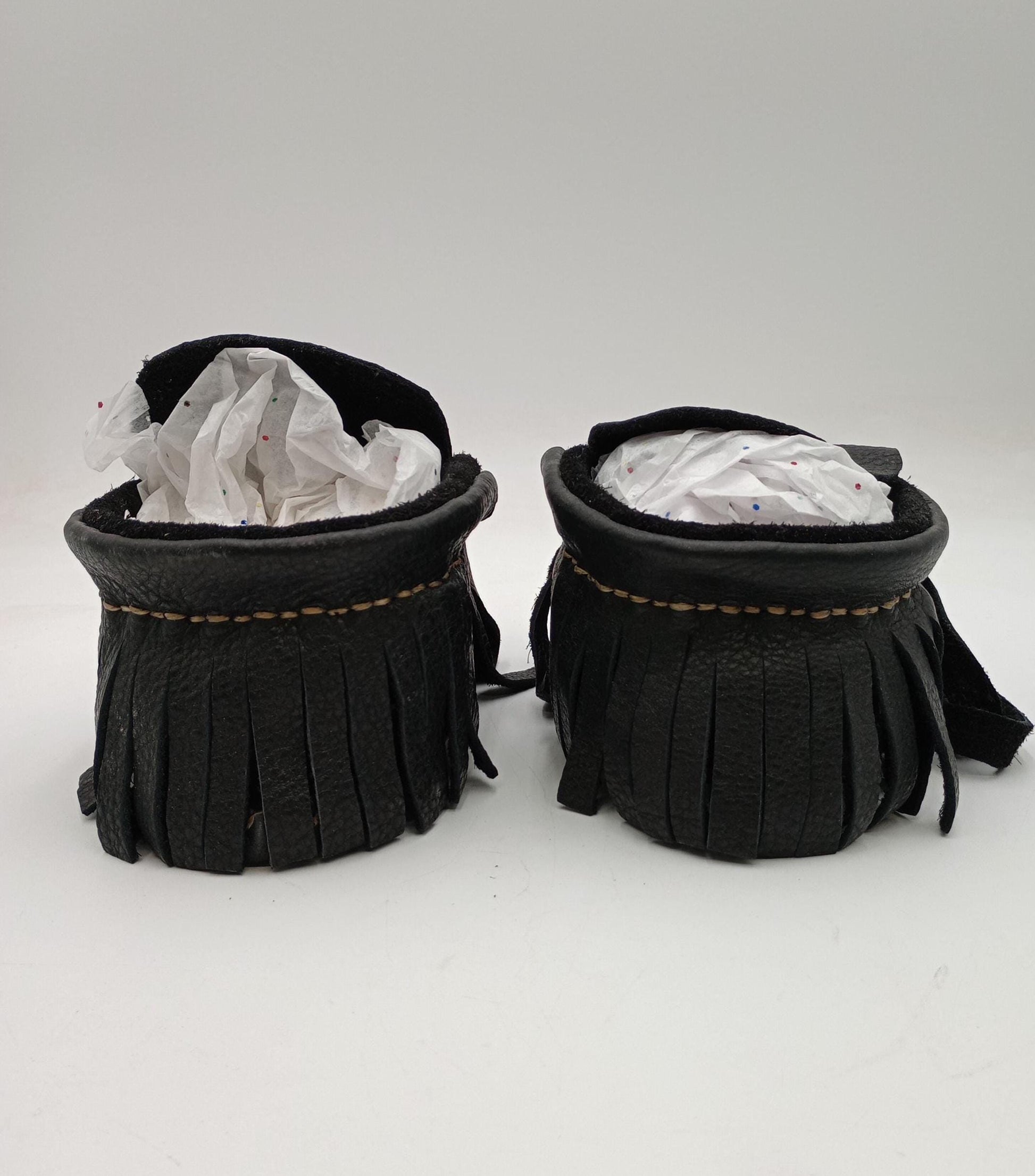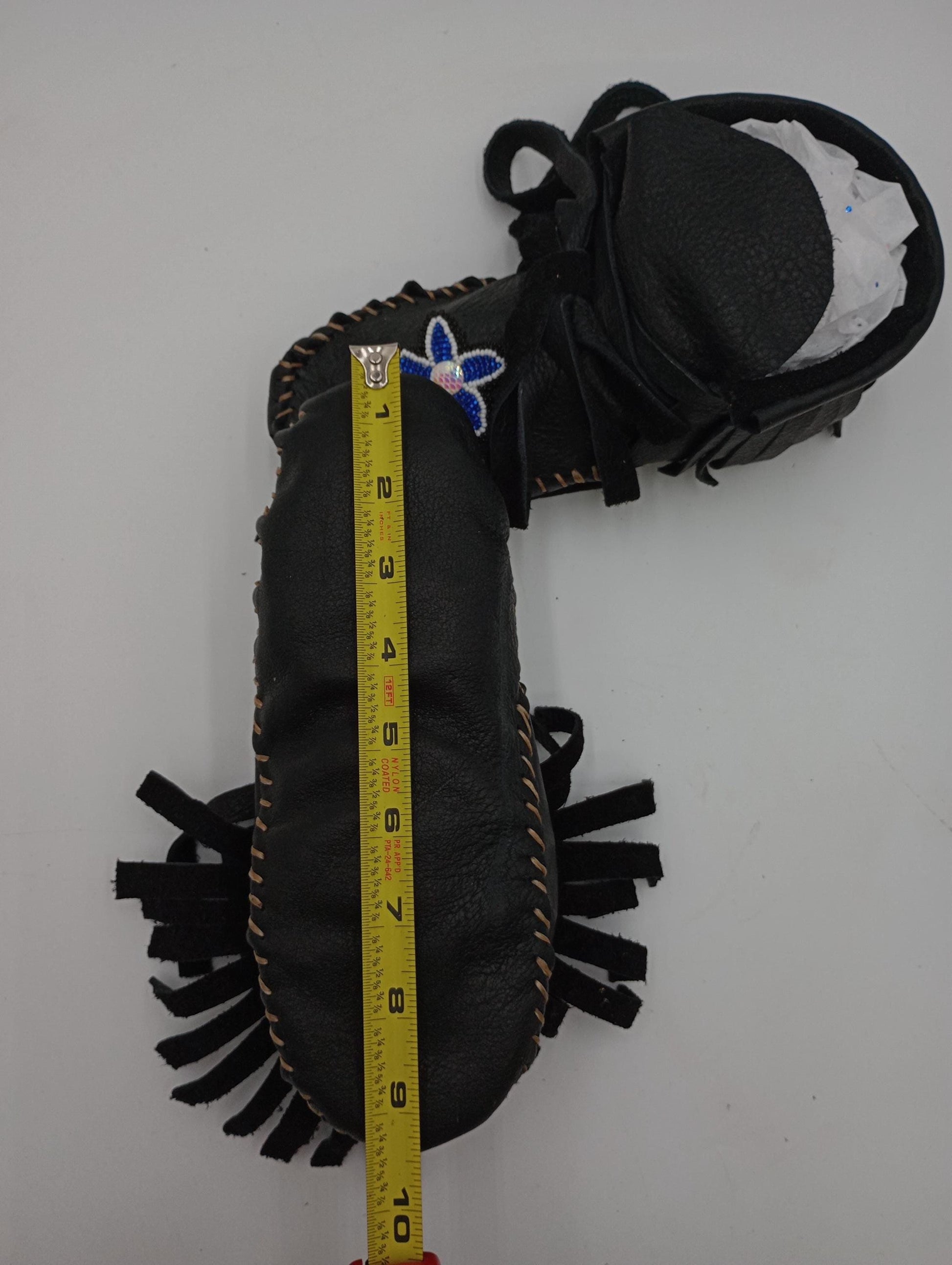Beautifully handmade beaded leather moccasins. Moccasins form to the foot but these are 9 1/2 inches long, a size small or approximately size 8 women's. Perfect for Pow Wows to match many styles of regalia. The only thing between the dancer and the earth in these moccasins is soft and natural leather.