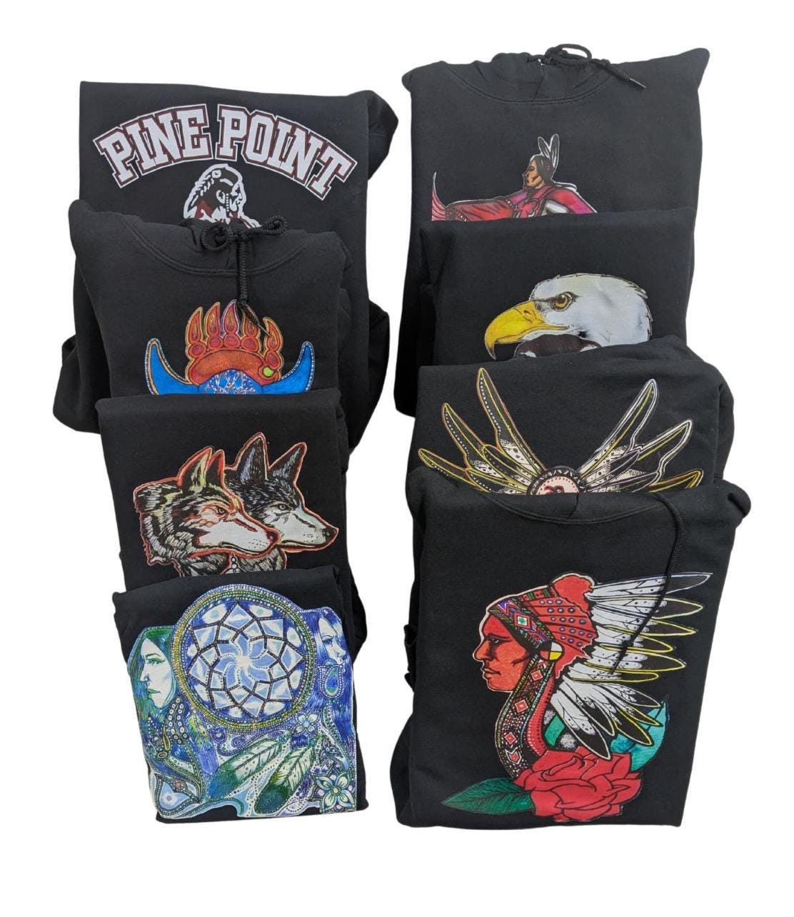 Original Indigenous Artwork Hoodies. Wear the symbols of a resilient and honorable culture. David Edwards art beautifully and vibrantly printed on heavyweight black hoodies.