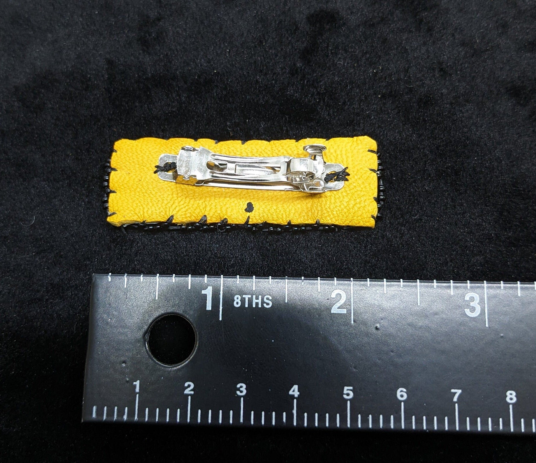 Beautifully hand beaded black, gold, pink, blue, red, and white design on leather backing and metal clip. 5/8 inch wide 2 1/4 inches long. This barrette was hand beaded by Angel Rose, a Pine Point tribal artisan in Northern Minnesota.